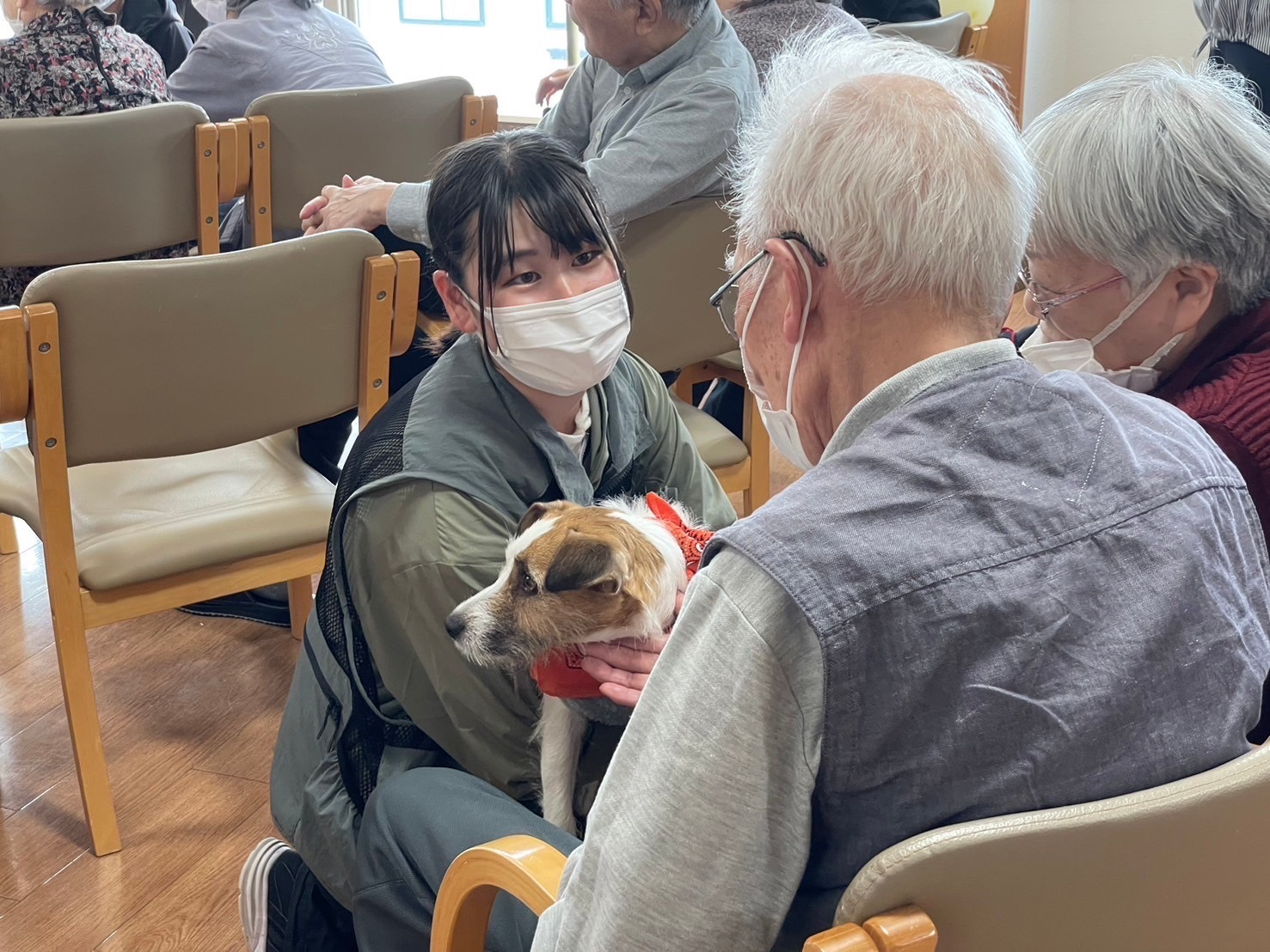 一つは、高齢者施設への訪問型セラピーです。実際に犬たちを施設へ連れて行き、日頃のトレーニングの成果やドッグダンスを披露したり、犬を介して利用者様とふれあいながら会話を楽しんでいただいています。