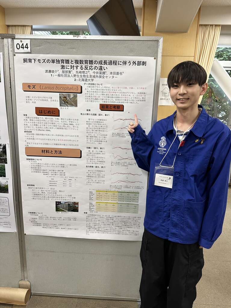 北海道エコ・動物自然専門学校の動物医療飼育学科 希少生物保全コースの4年生渡邊くんが、9月に北海学園大学(札幌市)で開催された日本鳥学会では、「飼育下モズの単独育雛と複数育雛の成長過程に伴う外部刺激に対する反応の違い」というテーマで発表しました。