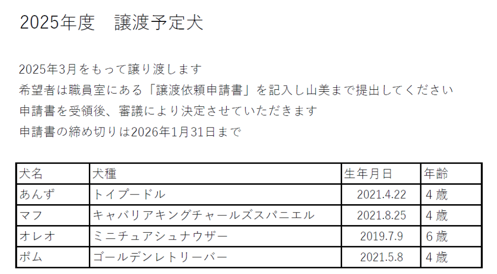 【在校生・卒業生のみなさまへ】譲渡予定犬について2025