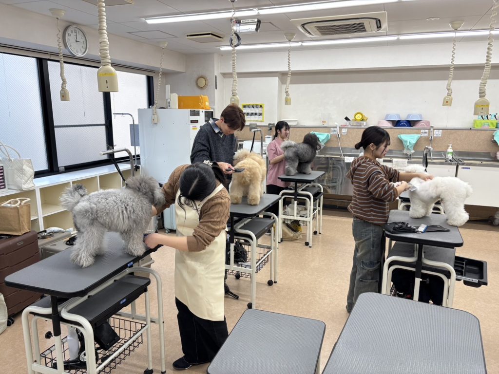 大会前日には会場でリハーサルを行い、道具の配置や動線の確認など本番を想定した最終調整を実施。その後は姉妹校である大阪eco動物海洋専門学校の実習室をお借りし、大会当日に最高のコンディションで臨めるよう丁寧にシャンプーを行い、万全の準備を整えました。