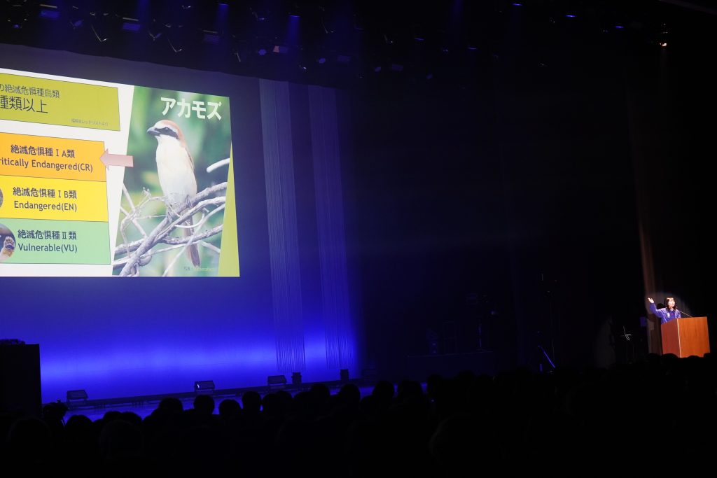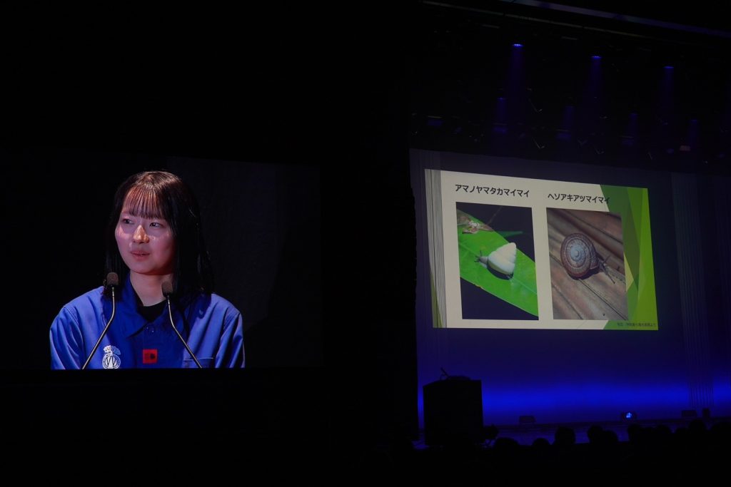 本校からは動物医療飼育学科の希少生物保全コースの学生が登壇し、人工育雛個体が本来のモズとしての性質を獲得するための環境づくりに関する研究や、沖縄産の希少陸貝ヘソアキアツマイマイやアマノヤマタカマイマイの個体数増加を目指した飼育下繁殖の取り組みについて発表しました。