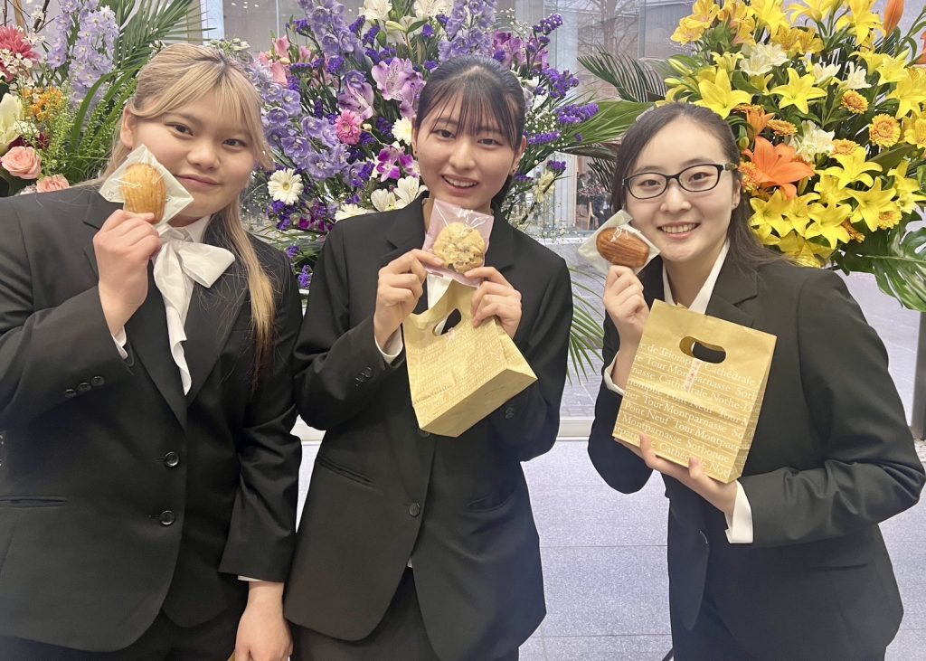 また、札幌ベルエポック製菓調理専門学校の学生が企画・運営する学内店舗「ベルズキッチン」の紹介では、実際に制作されたチャンククッキーとマドレーヌが新入生一人ひとりに配られ、会場には自然と笑顔が広がりました。